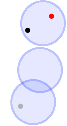 Tällä tavoin voitaisiin estää esim. puhelimella räjäytettävän pommin laukaisu. Ideana tämä on varsin hieno, mutta näen tässä erään melko pahan ongelman. Kun pommeja alkaa ilmaantua katukuvaan, yleensä ihmisillä on myös hätä. Kun näiltä ihmisiltä viedään mahdollisuus soittaa hätänumeroon, alkaa paniikki ja kaaos alueella. Havainnollistan itseäni kuvasarjalla. Kuvasarjassa ● on pommi, ● pommin räjäyttäjä, ● apua tarvitseva ja ◉ tukiaseman kuuluvuusalue.