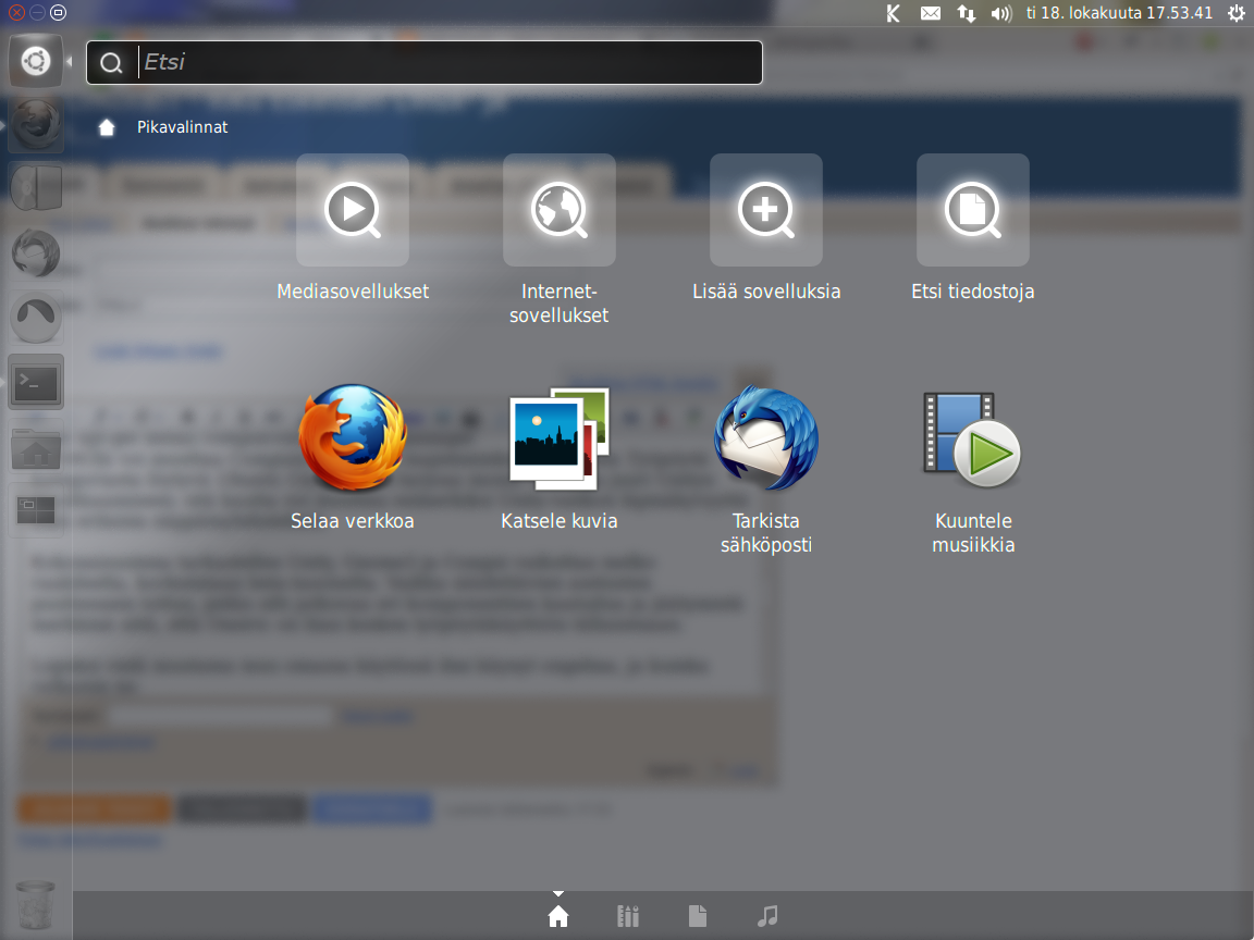 Myös toinen painajainen itselleni oli se, että ulkoasu on päätetty lähestulkoon taustakuvaa vaille valmiiksi, eikä sitä voi juurikaan muokata oletussovelluksin. Ulkoasuasetuksista voi valita taustakuvan ja widgettien tyylin, ei muuta. Kun vielä kaikkialla käytetään mielestäni rumaa ja epäselvää Ubuntu-fonttia, alkaa uusi Ubuntu todella käydä silmien ja hermojen päälle.